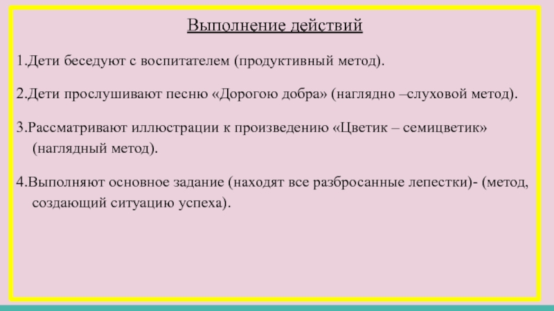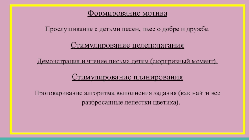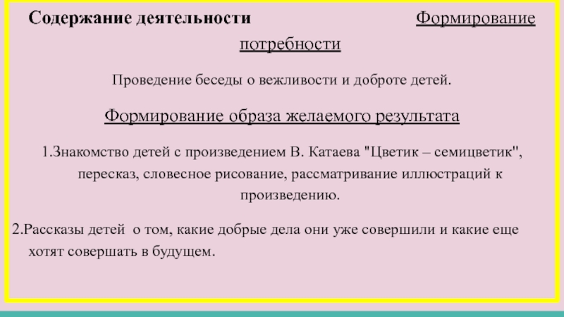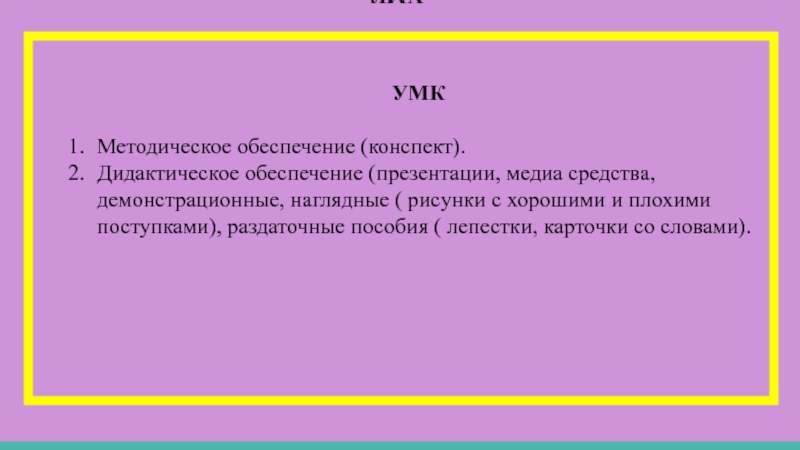 Дидактическое обеспечение (презентации, медиа средства, демонстрационные, наглядные ( рисунки с хорошими и плохими поступками), раздаточные пособия ( лепестки, карточки со словами).