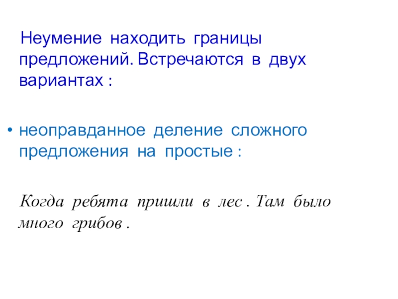 Слайд 16 Неумение находить границы предложений. Встречаются в двух вариантах :