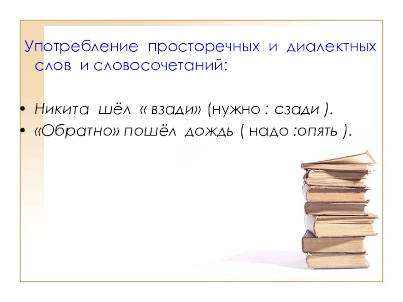 Слайд 7 Употребление просторечных и диалектных слов и словосочетаний: