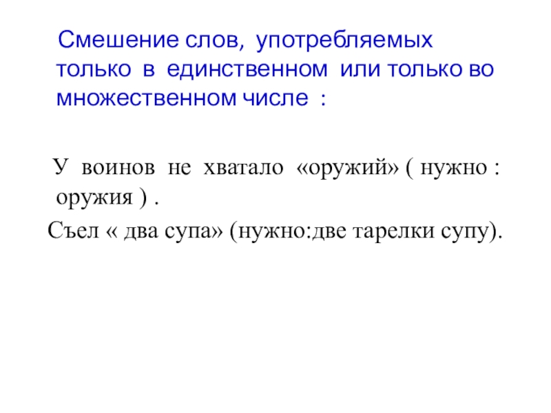 Слайд 10 Смешение слов, употребляемых только в единственном или только во