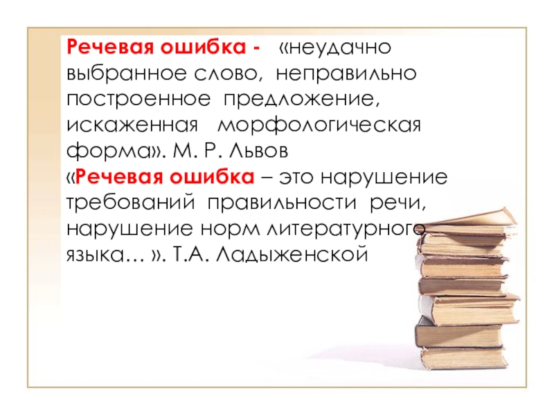 «Речевая ошибка – это нарушение требований правильности речи, нарушение норм литературного языка… ». Т.А. Ладыженской