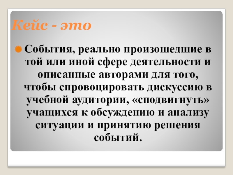 Кейс - этоСобытия, реально произошедшие в той или иной сфере деятельности и описанные авторами для того, чтобы