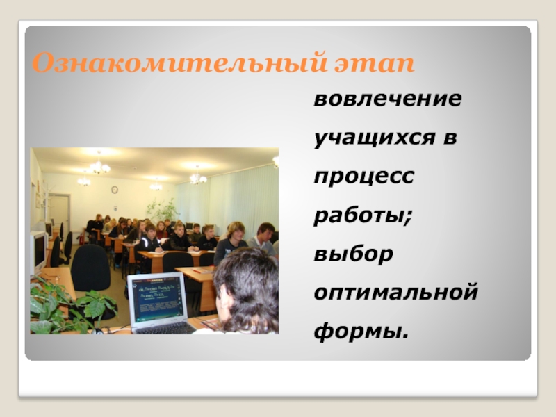 Ознакомительный этапвовлечение учащихся в процесс работы;выбор оптимальной формы.