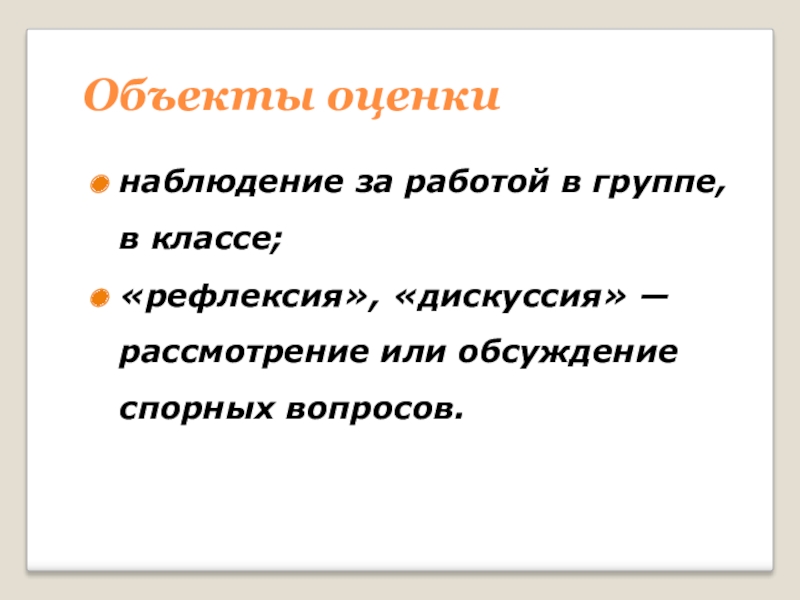 Объекты оценкинаблюдение за работой в группе, в классе;«рефлексия», «дискуссия» — рассмотрение или обсуждение спорных вопросов.