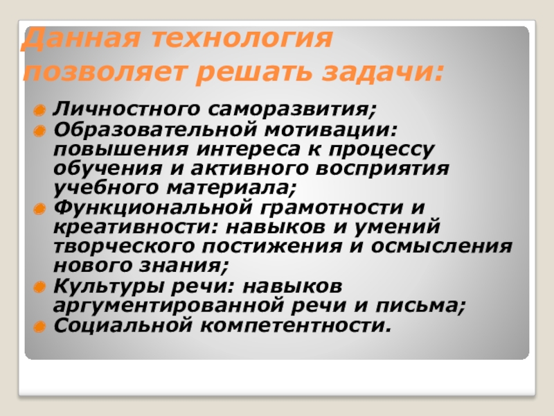 Данная технология позволяет решать задачи:Личностного саморазвития;Образовательной мотивации: повышения интереса к процессу обучения и активного восприятия учебного материала;Функциональной