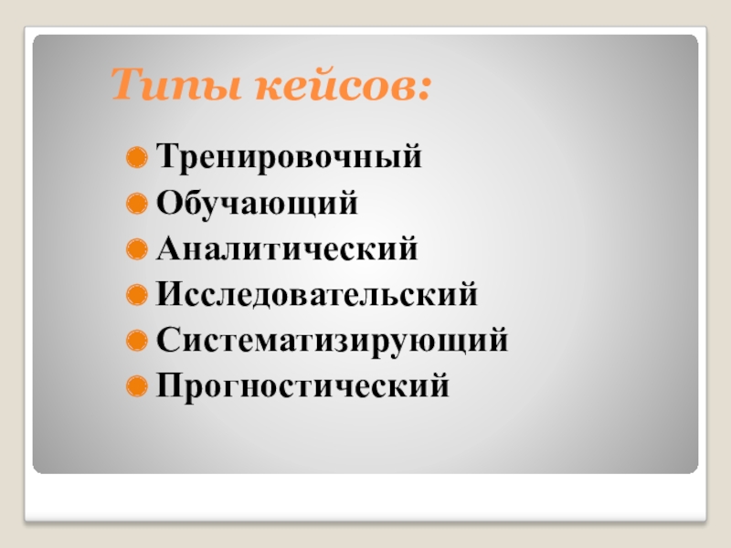 Типы кейсов: Тренировочный Обучающий Аналитический Исследовательский Систематизирующий Прогностический