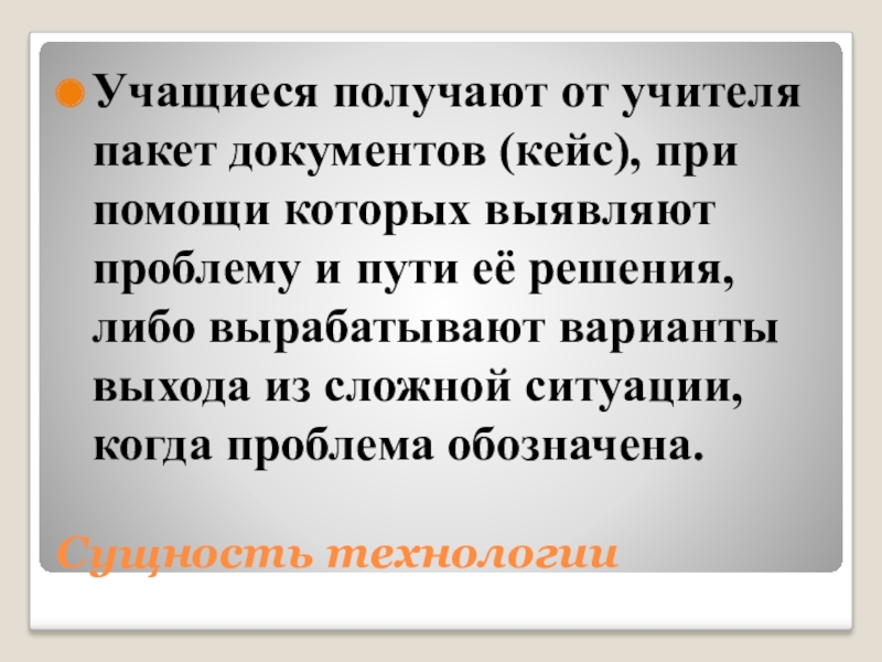 Сущность технологииУчащиеся получают от учителя пакет документов (кейс), при помощи которых выявляют проблему и пути её решения,