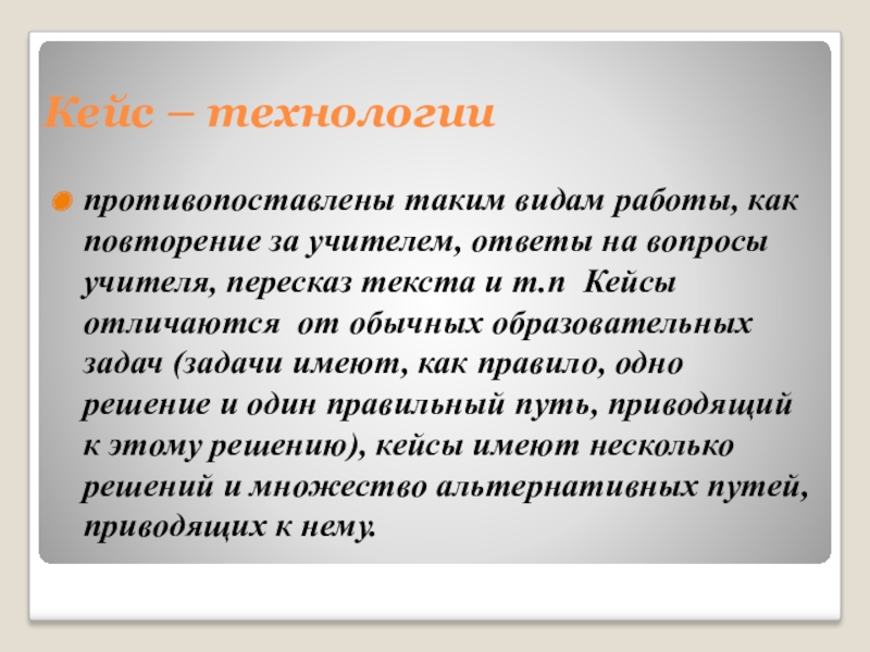 Кейс – технологиипротивопоставлены таким видам работы, как повторение за учителем, ответы на вопросы учителя, пересказ текста и