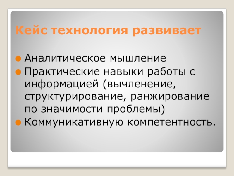 Кейс технология развиваетАналитическое мышлениеПрактические навыки работы с информацией (вычленение, структурирование, ранжирование по значимости проблемы)Коммуникативную компетентность.
