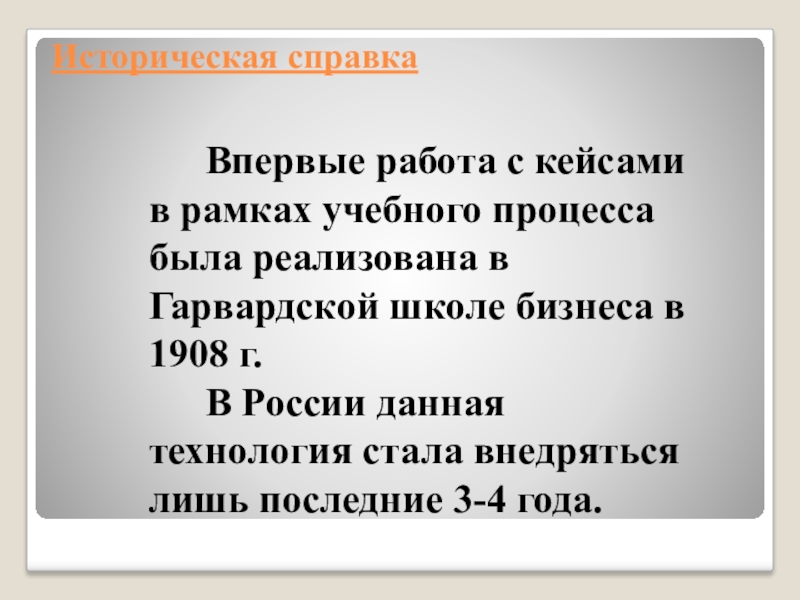 Историческая справка Впервые работа с кейсами в рамках учебного процесса была реализована в Гарвардской школе бизнеса в 1908 г.