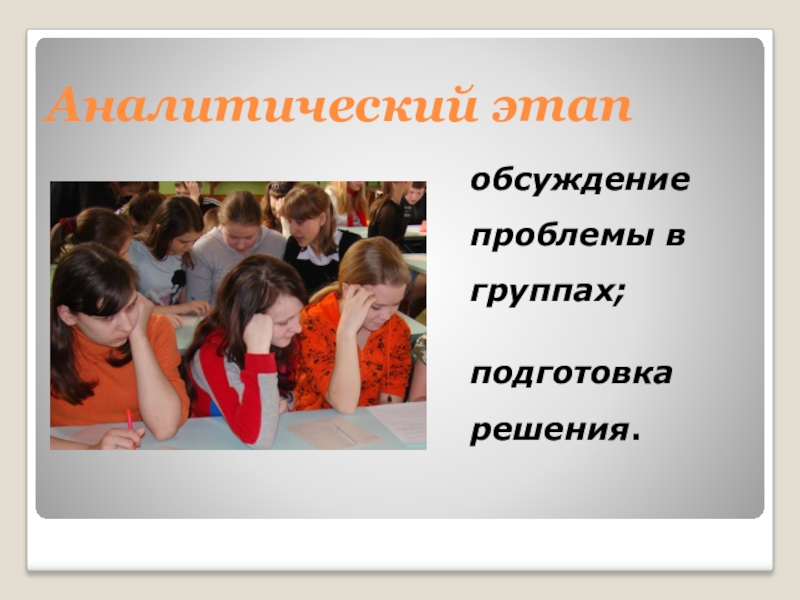 Аналитический этапобсуждение проблемы в группах;подготовка решения.
