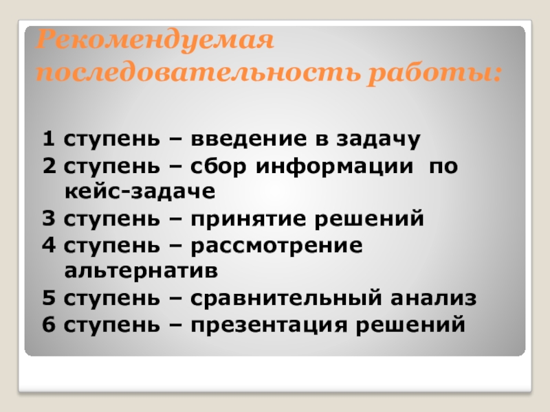Рекомендуемая последовательность работы:1 ступень – введение в задачу2 ступень – сбор информации по кейс-задаче3 ступень – принятие