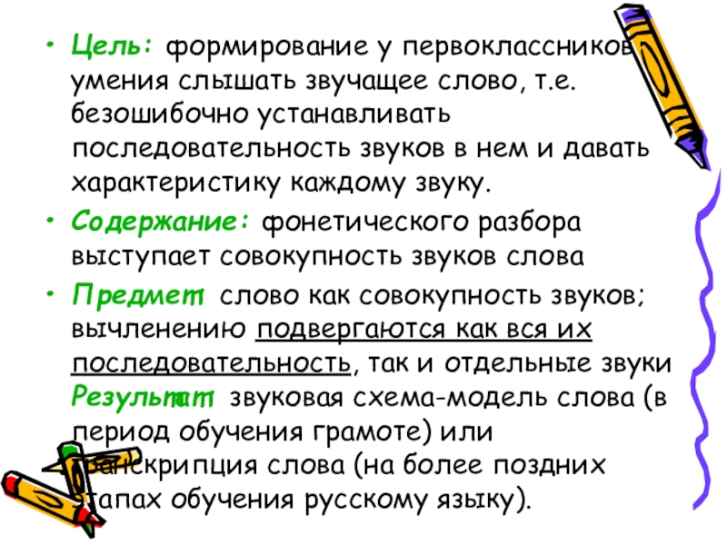 Предмет: слово как совокупность звуков; вычленению подвергаются как вся их последовательность, так и отдельные звуки Результат: звуковая схема-модель слова (в период обучения грамоте) или транскрипция слова (на более поздних этапах обучения русскому языку).
