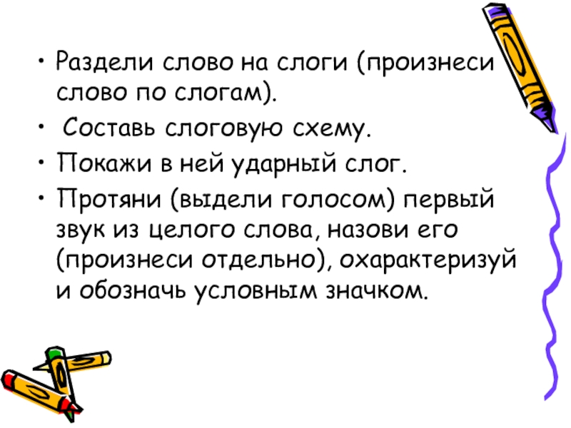 Протяни (выдели голосом) первый звук из целого слова, назови его (произнеси отдельно), охарактеризуй и обозначь условным значком.