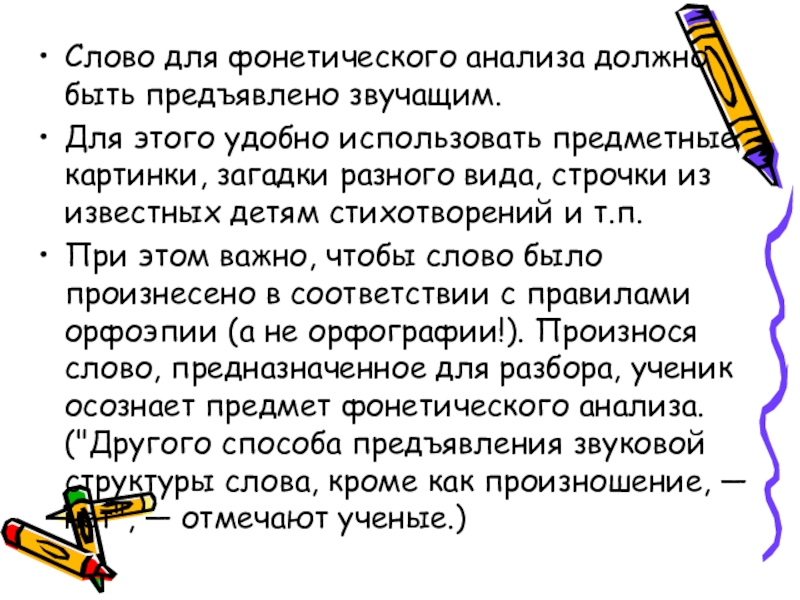 При этом важно, чтобы слово было произнесено в соответствии с правилами орфоэпии (а не орфографии!). Произнося слово, предназначенное для разбора, ученик осознает предмет фонетического анализа. ("Другого способа предъявления звуковой структуры слова, кроме как произношение, — нет", — отмечают ученые.)