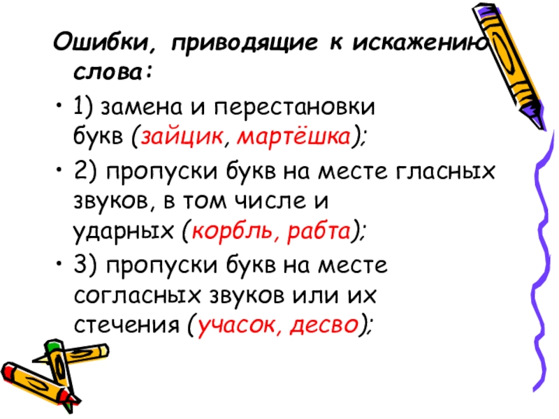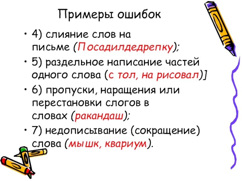 6) пропуски, наращения или перестановки слогов в словах (ракандаш);