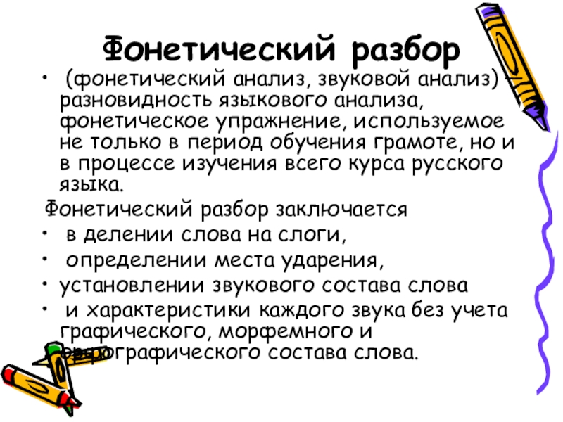 Содержание: фонетического разбора выступает совокупность звуков слова