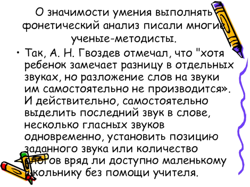 Гвоздев отмечал, что "хотя ребенок замечает разницу в отдельных звуках, но разложение слов на звуки им самостоятельно не производится». И действительно, самостоятельно выделить последний звук в слове, несколько гласных звуков одновременно, установить позицию заданного звука или количество слогов вряд ли доступно маленькому школьнику без помощи учителя.
