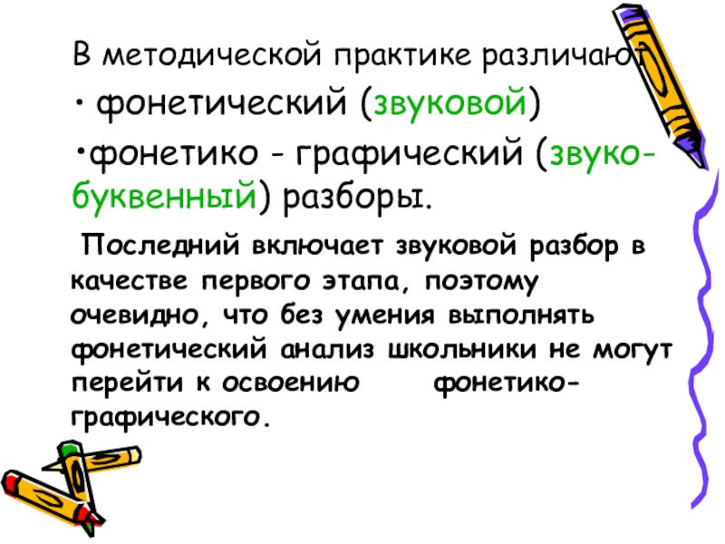 Последний включает звуковой разбор в качестве первого этапа, поэтому очевидно, что без умения выполнять фонетический анализ школьники не могут перейти к освоению фонетико- графического.