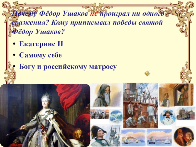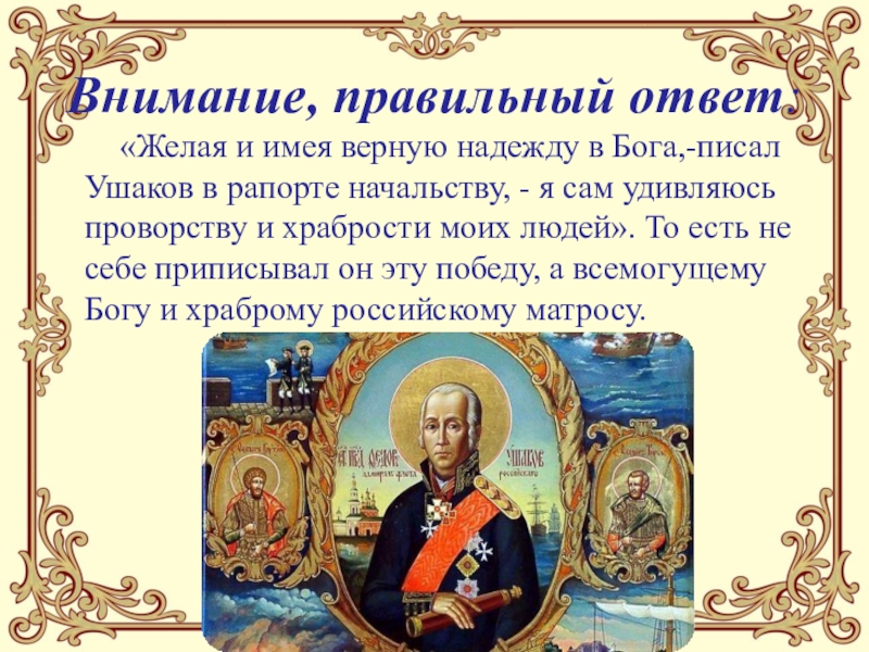 Слайд 19Почему Фёдор Ушаков не проиграл ни одного сражения? Кому приписывал победы