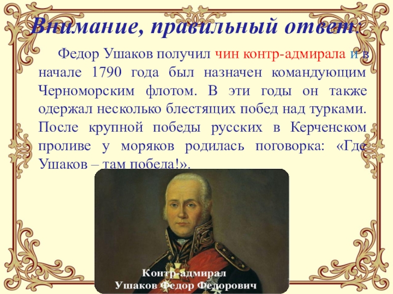 контр-адмирала и в начале 1790 года был назначен командующим Черноморским флотом. В эти годы он также одержал несколько блестящих побед над турками. После крупной победы русских в Керченском проливе у моряков родилась поговорка: «Где Ушаков – там победа!».
