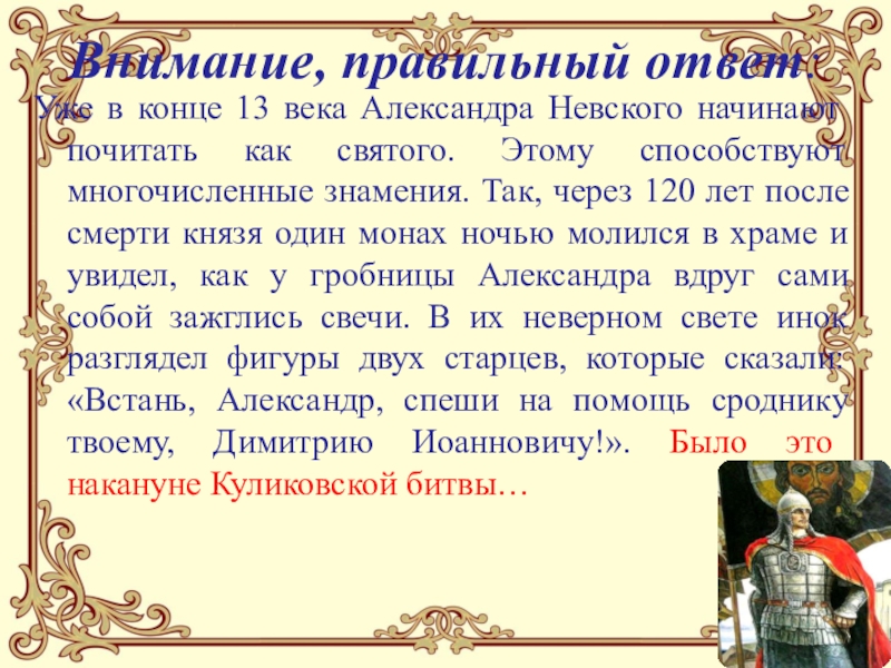 как святого. Этому способствуют многочисленные знамения. Так, через 120 лет после смерти князя один монах ночью молился в храме и увидел, как у гробницы Александра вдруг сами собой зажглись свечи. В их неверном свете инок разглядел фигуры двух старцев, которые сказали: «Встань, Александр, спеши на помощь сроднику твоему, Димитрию Иоанновичу!». Было это накануне Куликовской битвы…