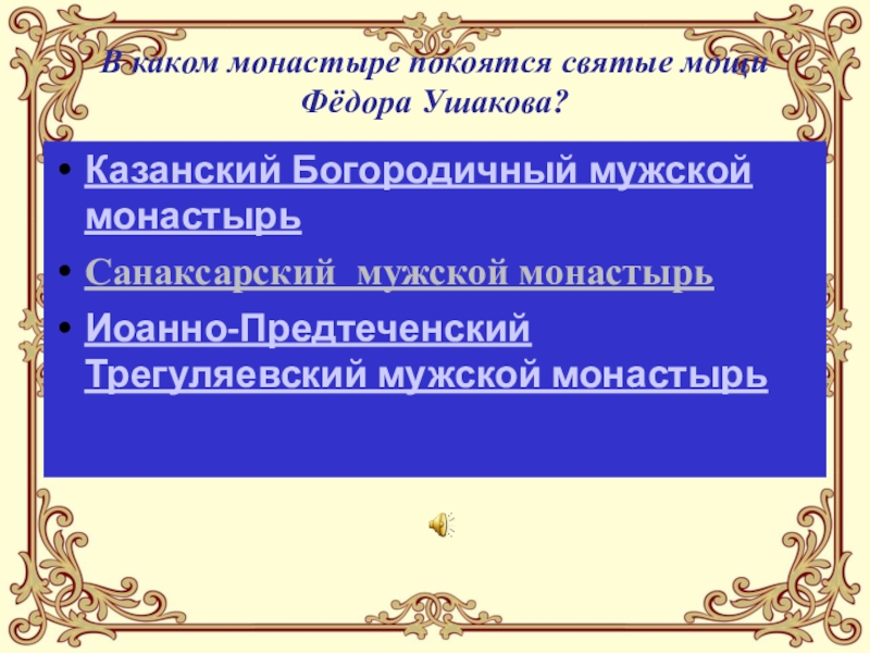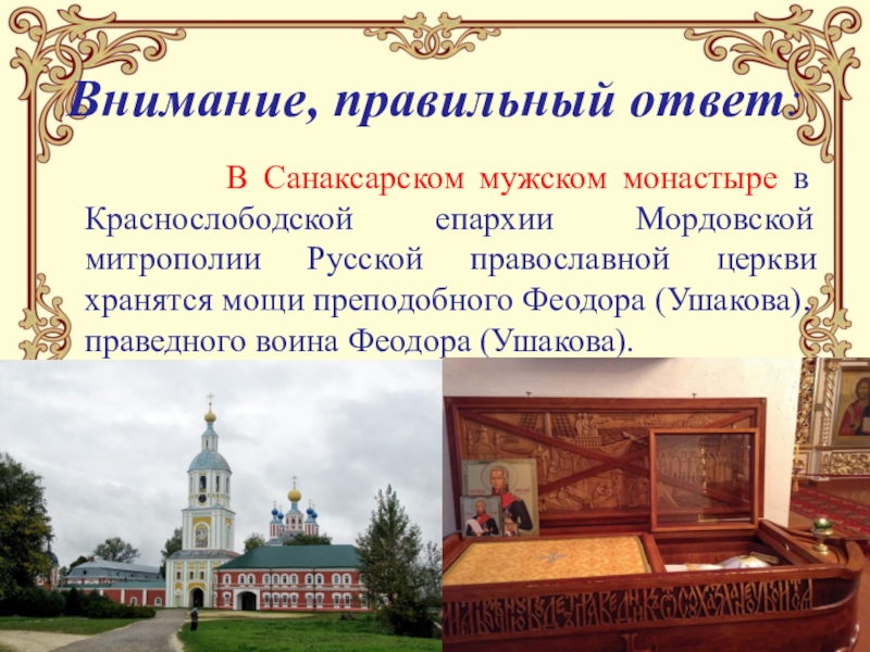 Слайд 22В каком монастыре покоятся святые мощи Фёдора Ушакова?