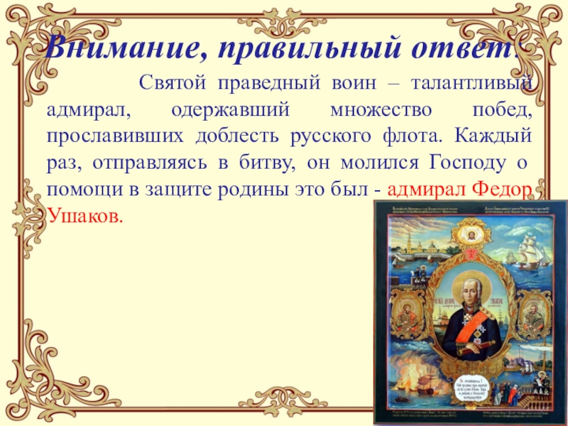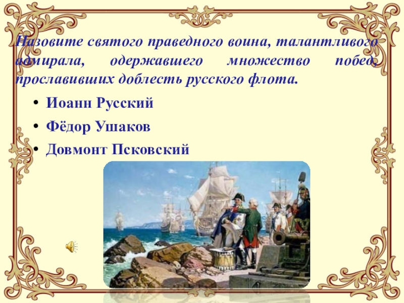 Слайд 15Назовите святого праведного воина, талантливого адмирала, одержавшего множество побед, прославивших доблесть