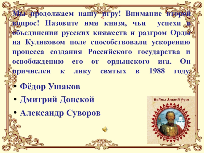 Мы продолжаем нашу игру! Внимание второй вопрос! Назовите имя князя, чьи