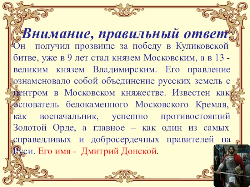 в 9 лет стал князем Московским, а в 13 - великим князем Владимирским. Его правление ознаменовало собой объединение русских земель с центром в Московском княжестве. Известен как основатель белокаменного Московского Кремля, как военачальник, успешно противостоящий Золотой Орде, а главное – как один из самых справедливых и добросердечных правителей на Руси. Его имя - Дмитрий Донской.