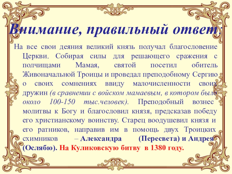 Собирая силы для решающего сражения с полчищами Мамая, святой посетил обитель Живоначальной Троицы и проведал преподобному Сергию о своих сомнениях ввиду малочисленности своих дружин (в сравнении с войском мамаевым, в котором было около 100-150 тыс.человек). Преподобный вознес молитвы к Богу и благословил князя, предсказав победу его христианскому воинству. Старец воодушевил князя и его ратников, направив им в помощь двух Троицких схимников – Александра (Пересвета) и Андрея (Ослябю). На Куликовскую битву в 1380 году.