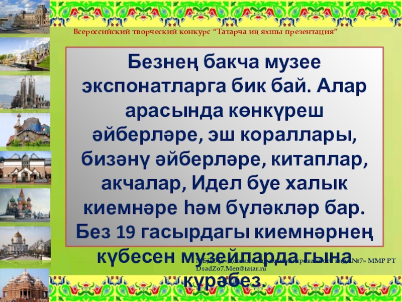 Безнең бакча музее экспонатларга бик бай. Алар арасында көнкүреш әйберләре, эш кораллары, бизәнү әйберләре, китаплар, акчалар, Идел буе халык киемнәре һәм бүләкләр бар.