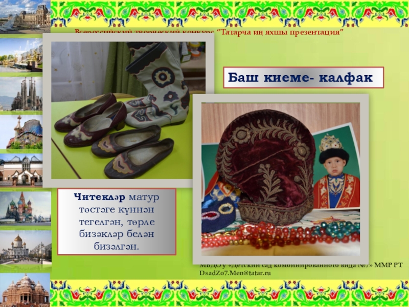 Читекләр матур төстәге күннән тегелгән, төрле бизәкләр белән бизәлгән.