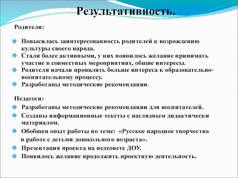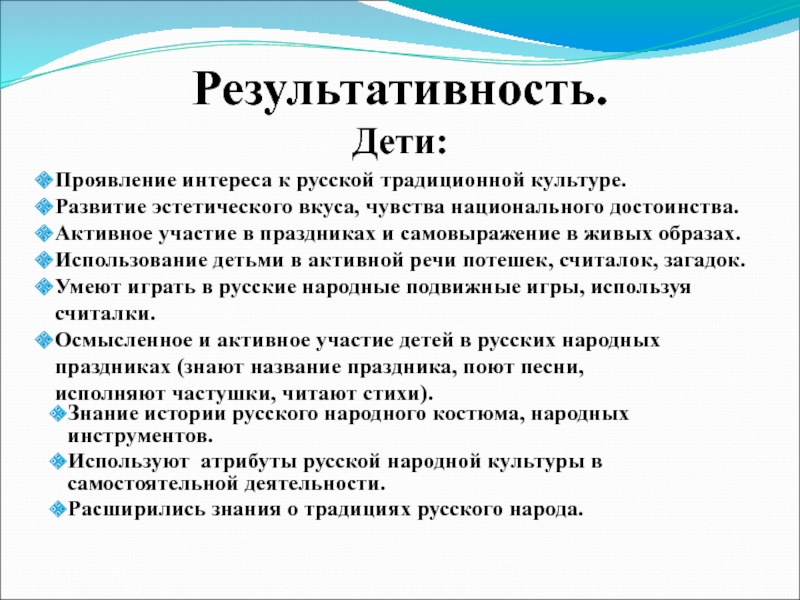 Осмысленное и активное участие детей в русских народных праздниках (знают название праздника, поют песни,