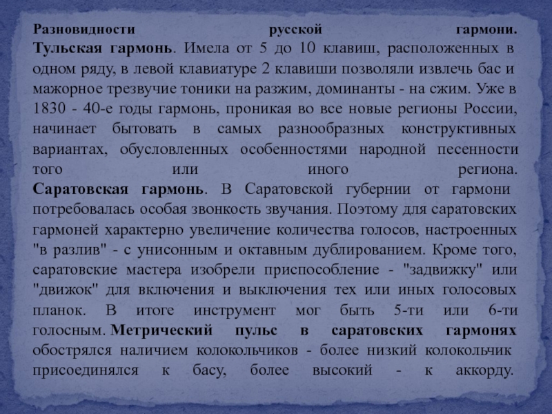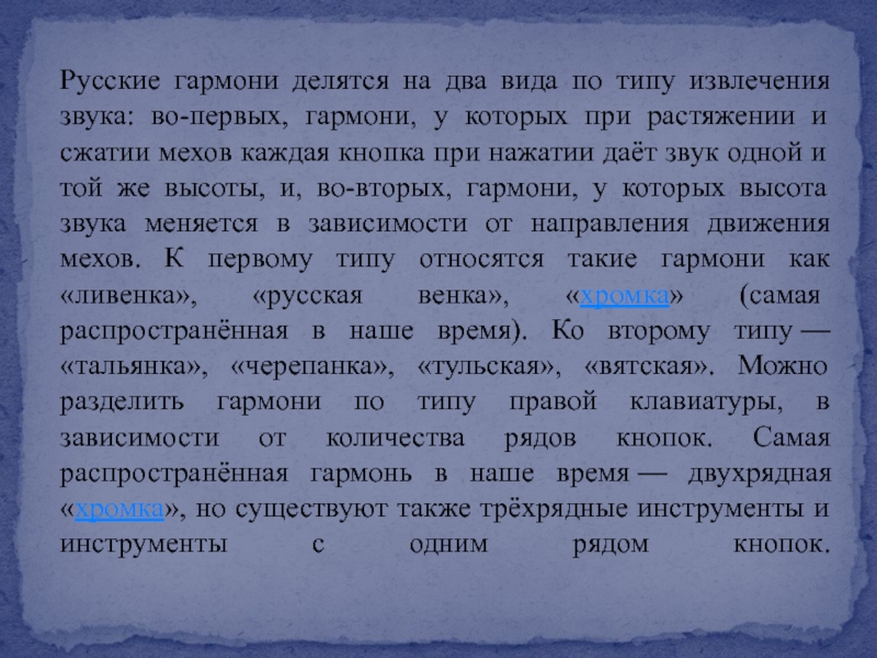 Русские гармони делятся на два вида по типу извлечения звука: во-первых,