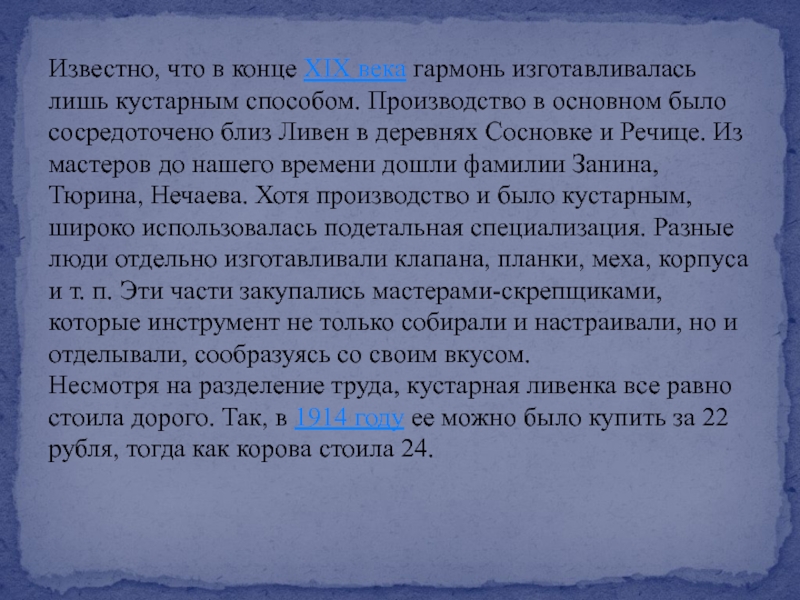Известно, что в конце XIX века гармонь изготавливалась лишь кустарным способом. Производство в