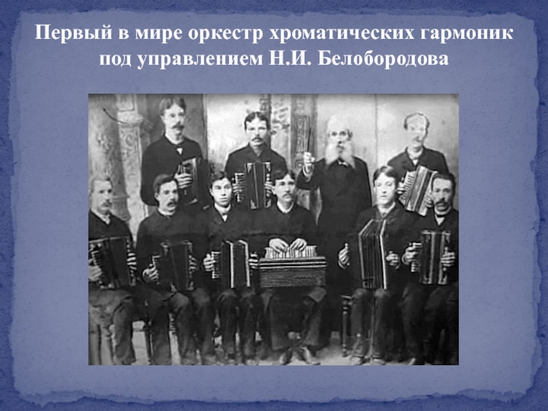 Слайд 11Первый в мире оркестр хроматических гармоник под управлением Н.И. Белобородова