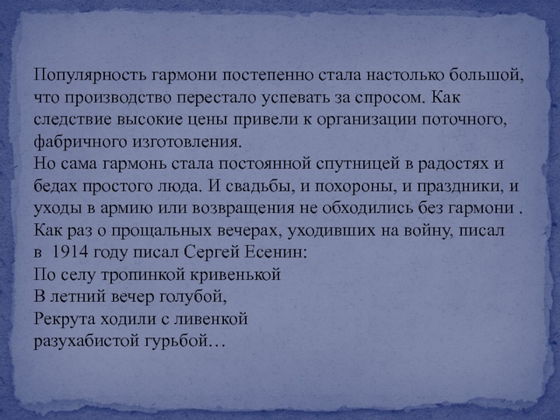 Но сама гармонь стала постоянной спутницей в радостях и бедах простого люда. И свадьбы, и похороны, и праздники, и уходы в армию или возвращения не обходились без гармони . Как раз о прощальных вечерах, уходивших на войну, писал в 1914 году писал Сергей Есенин: