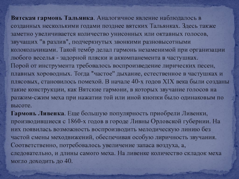 Слайд 7Вятская гармонь Тальянка. Аналогичное явление наблюдалось в созданных несколькими годами позднее
