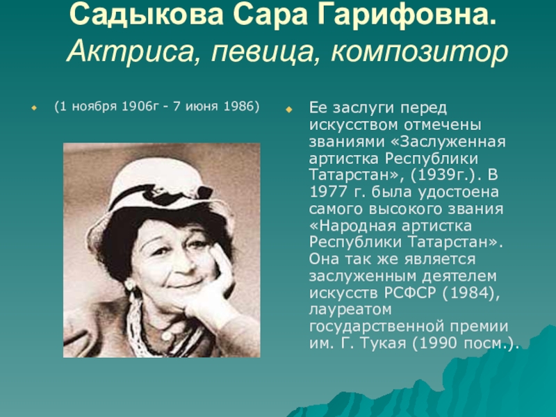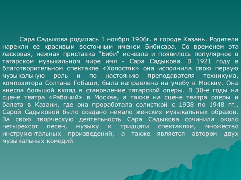 Слайд 11 Сара Садыкова родилась 1 ноября 1906г. в городе Казань. Родители