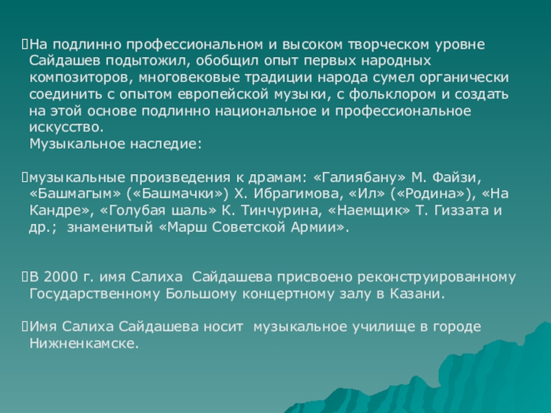 Слайд 3На подлинно профессиональном и высоком творческом уровне Сайдашев подытожил, обобщил опыт