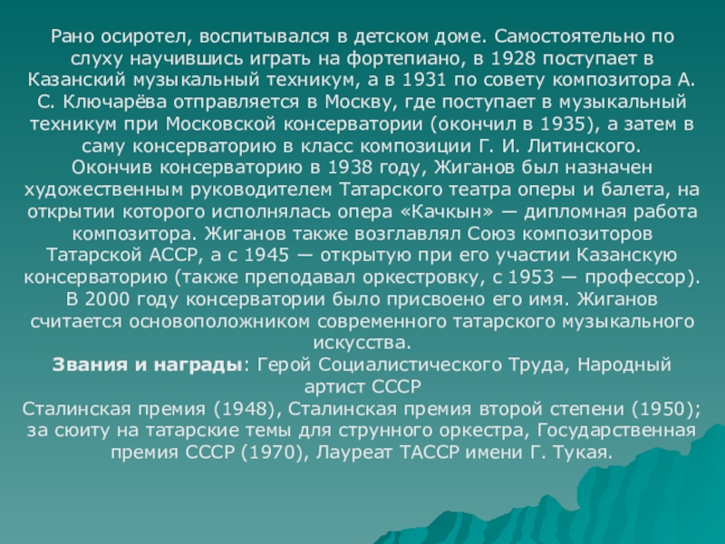 Окончив консерваторию в 1938 году, Жиганов был назначен художественным руководителем Татарского театра оперы и балета, на открытии которого исполнялась опера «Качкын» ― дипломная работа композитора. Жиганов также возглавлял Союз композиторов Татарской АССР, а с 1945 ― открытую при его участии Казанскую консерваторию (также преподавал оркестровку, с 1953 ― профессор). В 2000 году консерватории было присвоено его имя. Жиганов считается основоположником современного татарского музыкального искусства.