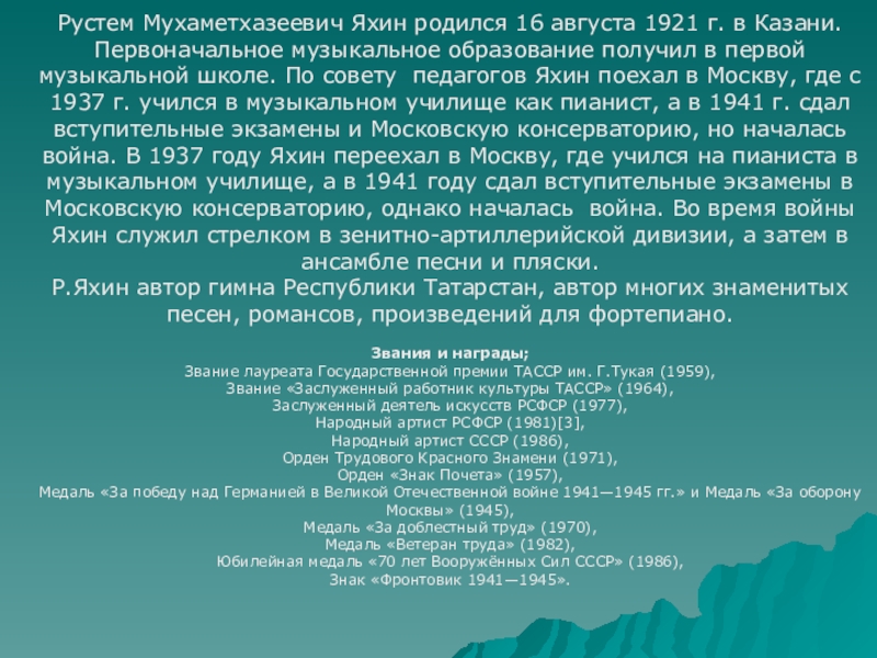 Р.Яхин автор гимна Республики Татарстан, автор многих знаменитых песен, романсов, произведений для фортепиано.