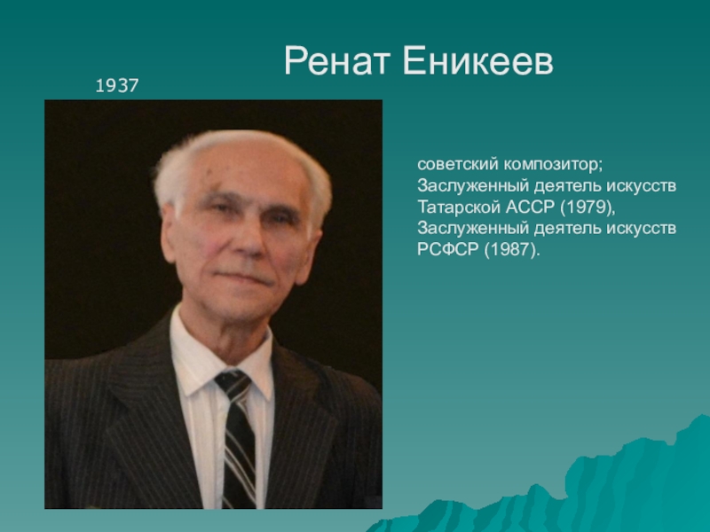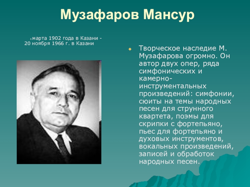 Слайд 9Композитор Мансур Музафаров - один из основоположников татарской профессиональной музыки. Он