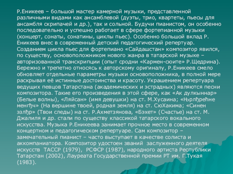 Слайд 19Р.Еникеев – большой мастер камерной музыки, представленной различными видами как ансамблевой