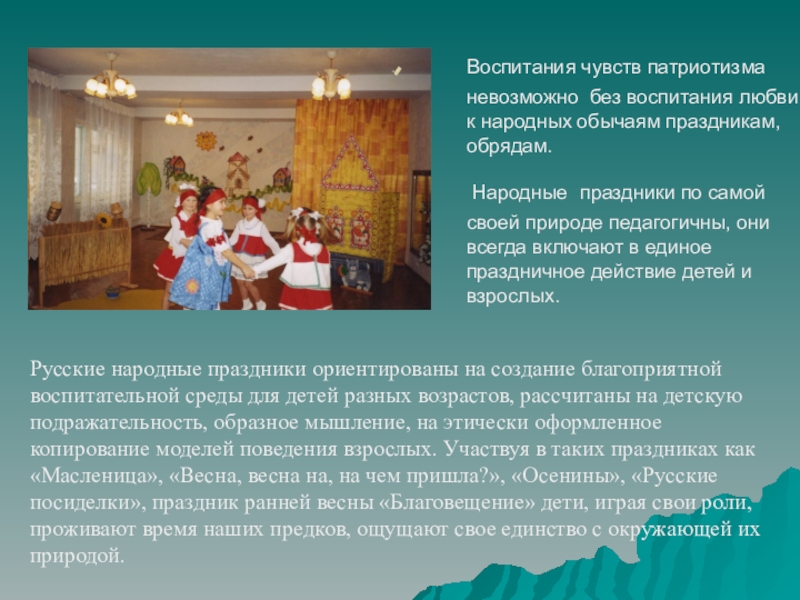 Русские народные праздники ориентированы на создание благоприятной воспитательной среды для детей разных возрастов, рассчитаны на детскую подражательность, образное мышление, на этически оформленное копирование моделей поведения взрослых. Участвуя в таких праздниках как «Масленица», «Весна, весна на, на чем пришла?», «Осенины», «Русские посиделки», праздник ранней весны «Благовещение» дети, играя свои роли, проживают время наших предков, ощущают свое единство с окружающей их природой.