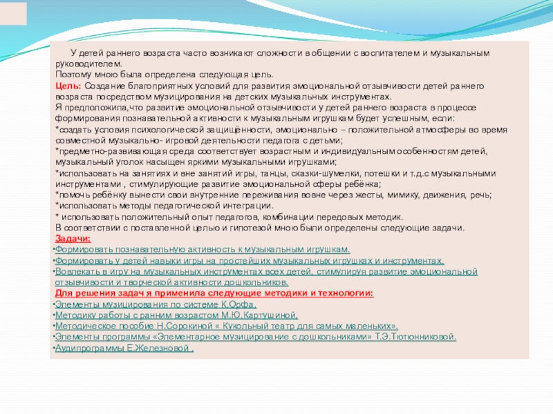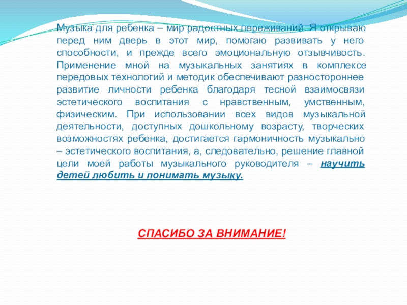 дверь в этот мир, помогаю развивать у него способности, и прежде всего эмоциональную отзывчивость. Применение мной на музыкальных занятиях в комплексе передовых технологий и методик обеспечивают разностороннее развитие личности ребенка благодаря тесной взаимосвязи эстетического воспитания с нравственным, умственным, физическим. При использовании всех видов музыкальной деятельности, доступных дошкольному возрасту, творческих возможностях ребенка, достигается гармоничность музыкально – эстетического воспитания, а, следовательно, решение главной цели моей работы музыкального руководителя – научить детей любить и понимать музыку.