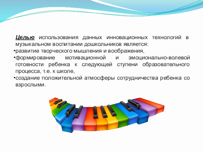 Слайд 10Целью использования данных инновационных технологий в музыкальном воспитании дошкольников является: