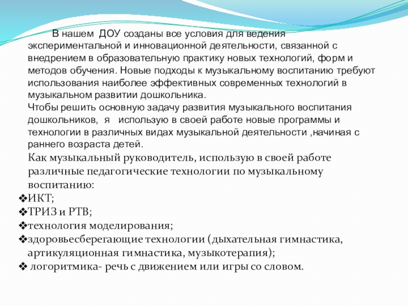 деятельности, связанной с внедрением в образовательную практику новых технологий, форм и методов обучения. Новые подходы к музыкальному воспитанию требуют использования наиболее эффективных современных технологий в музыкальном развитии дошкольника.