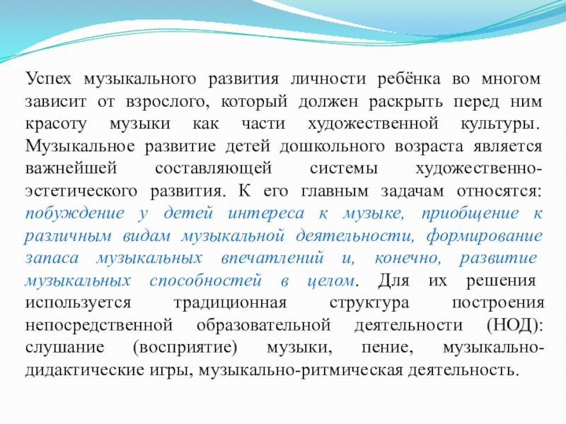 должен раскрыть перед ним красоту музыки как части художественной культуры. Музыкальное развитие детей дошкольного возраста является важнейшей составляющей системы художественно-эстетического развития. К его главным задачам относятся: побуждение у детей интереса к музыке, приобщение к различным видам музыкальной деятельности, формирование запаса музыкальных впечатлений и, конечно, развитие музыкальных способностей в целом. Для их решения используется традиционная структура построения непосредственной образовательной деятельности (НОД): слушание (восприятие) музыки, пение, музыкально-дидактические игры, музыкально-ритмическая деятельность.